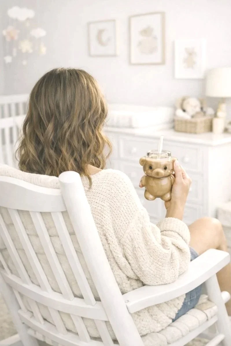 La bolsa incluye un detalle para la mamá: Un baso de vidrio en forma de osito con su popote transparente.